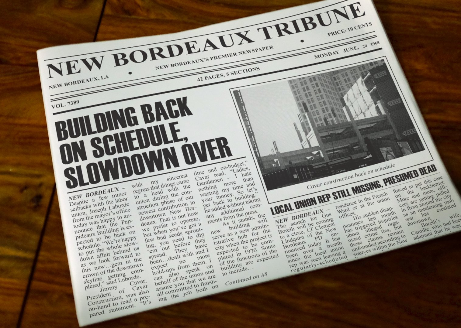 New Bordeaux Tribune je názov novín, ktoré sa tlačia v New Bordeaux a pravidelne informujú aj o záležitostiach louisianskej mafie. (pre zväčšenie kliknite na obrázky)