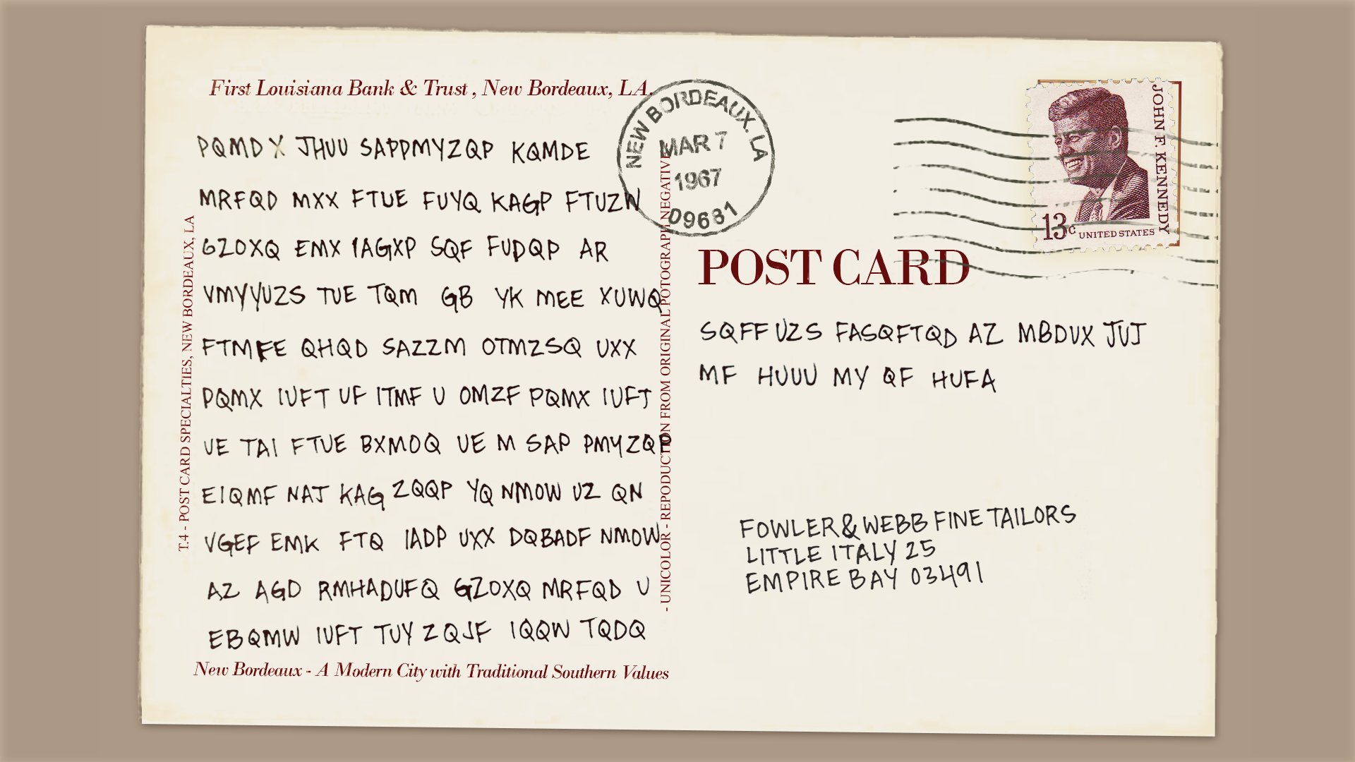 Pohľadnice, ktoré píše Vito nejakému "L" do Empire Bay sú väčšinou v Cézarovej šifre, alebo vynecháte pár slov a máte zmysluplnejší text.